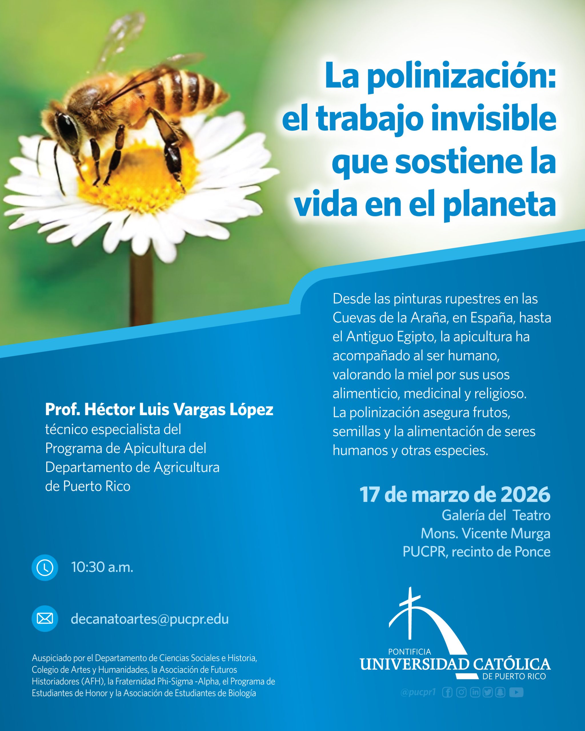La polinización: el trabajo invisible que sostiene el planeta By celimer_torres@pucpr.edu | March 13, 2026 Apicultor ofrece conferencia sobre la importancia de este tema en la alimentación de humanos y otras especies Posted in General ← Pioneros de excelencia reciben el Premio del PresidentePrevención de la violencia sexual en el contexto universitario →