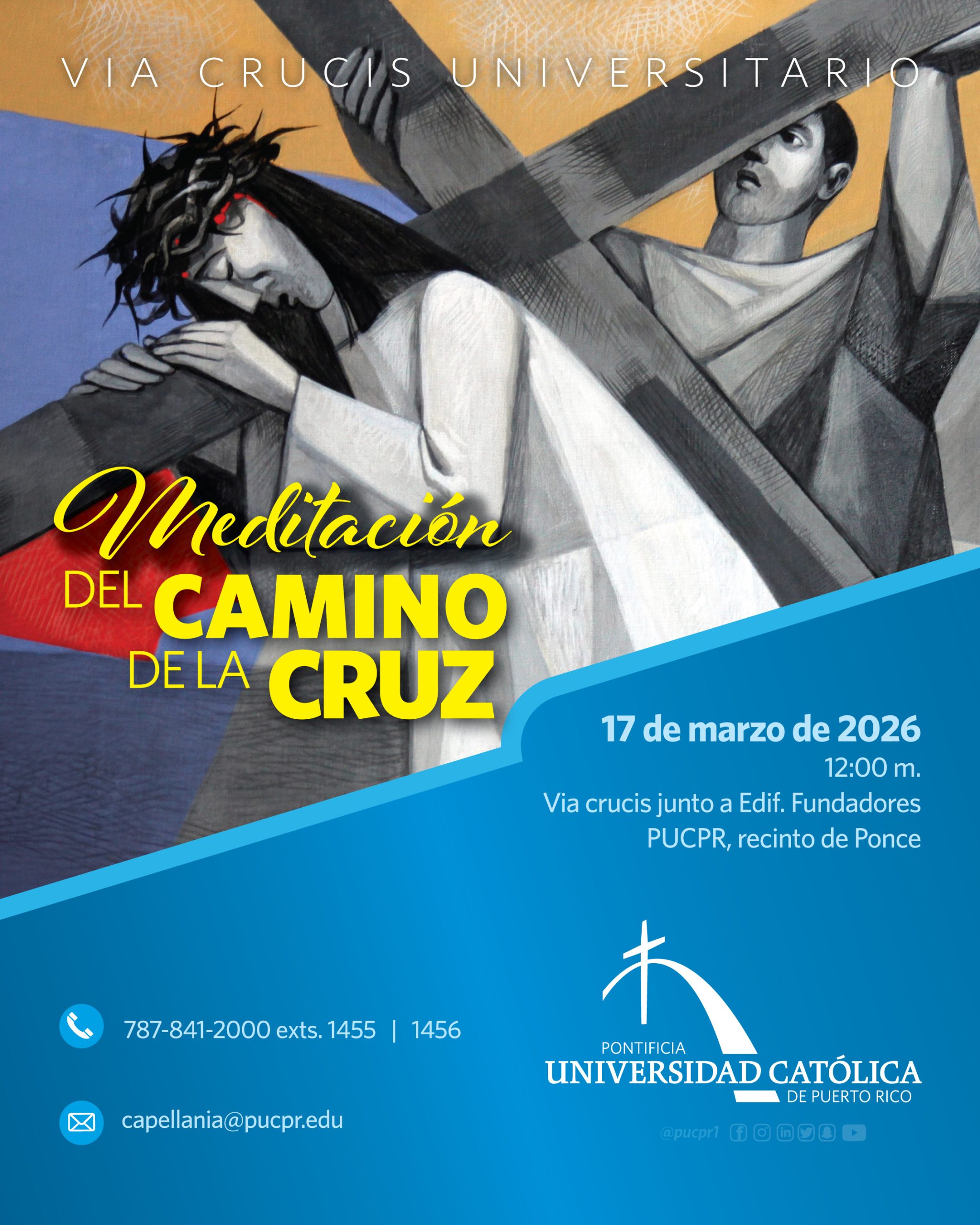 Meditación del camino de la cruz By celimer_torres@pucpr.edu | March 6, 2026 Capellanía invita al Via Crucis Universitario Posted in General ← Anecdotario de un periodista silvestre: y algunas lecciones aprendidasEl cristianismo: ¿una religión más o un acontecimiento único? →