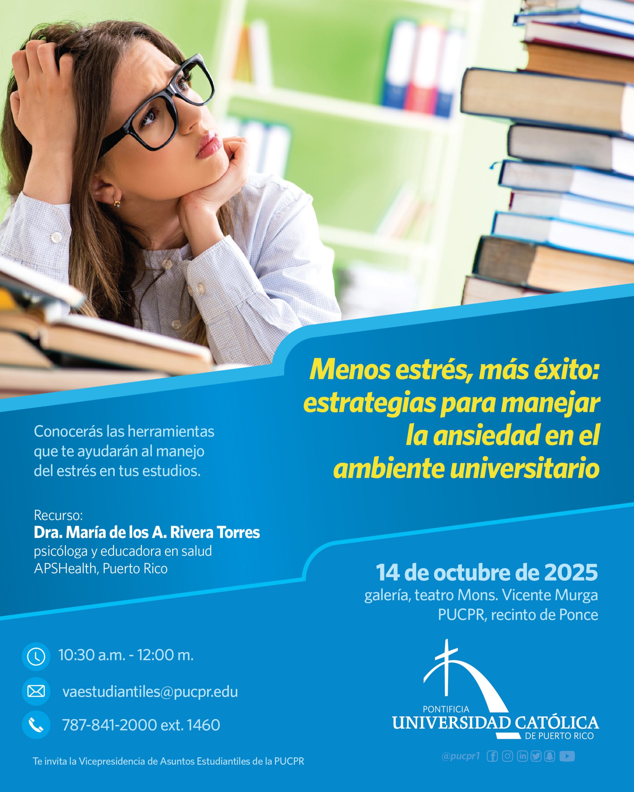 Menos estrés, más éxito By celimer_torres@pucpr.edu | October 2, 2025 Conoce estrategias para manejar la ansiedad en el ambiente universitario. Posted in General ← Casi casi una gala¿Lo tuyo es la biotecnología médica? →