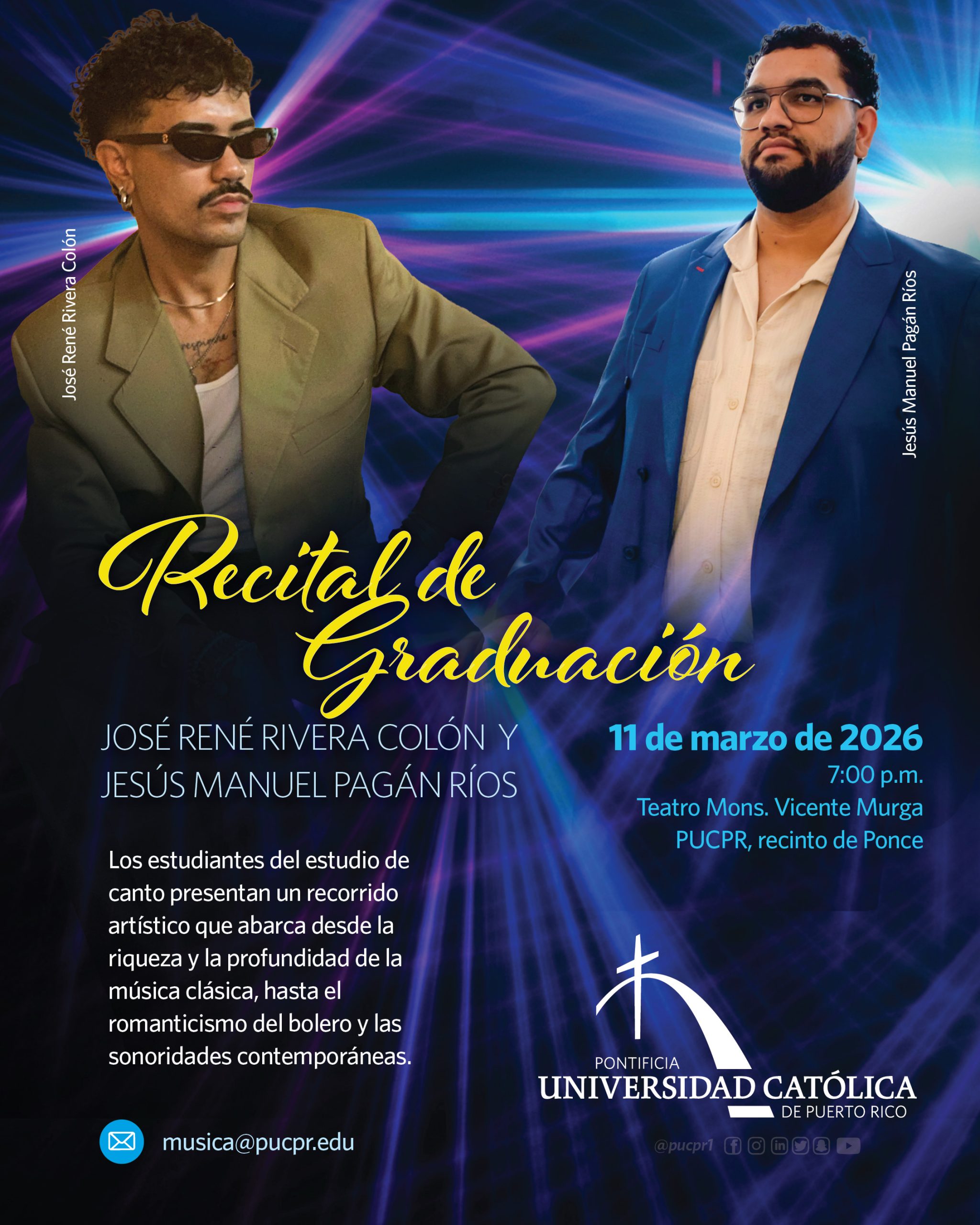 Recital de Graduación By celimer_torres@pucpr.edu | February 19, 2026 José René Rivera y Jesús Manuel Pagán, estudiantes de canto, presentan un recorrido musical por distintos géneros musicales. Posted in General ← Pioneros saludablesEl reverso de un barrio: tertulia sobre las voces silenciadas de la comunidad, literatura y marginalidad →